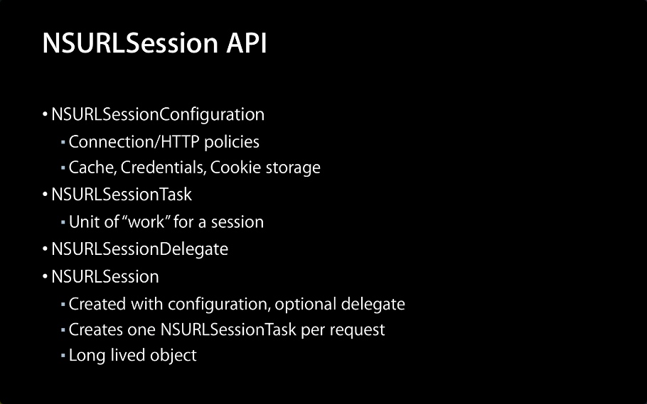 NSURLConnection来执行网络请求. 应用开发人员需要管理链接池,并处理应用后台/中断以及请求的恢复. 从iOS7开始,苹果发布了NSURLSession用来替代NSURLConnection